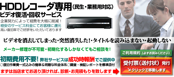 | Lv.B (物理障害等) | レベルAに加え、HDD装置自身の機能不全が発生しているもの(異音がする、など)・ビデオデータが暗号化されて記録されているものなどは、初期診断後の見積もり。株式会社アップルワン(東京都渋谷区)のHDD・ブルーレイビデオデータ復旧技術によるご提供とさせていただきます。 |